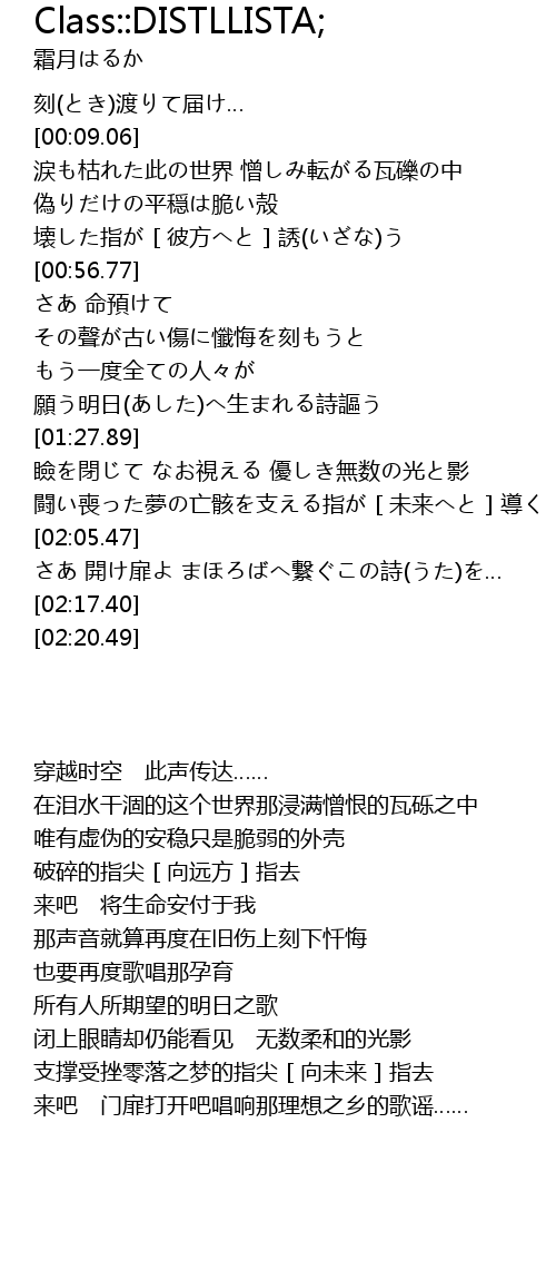 | [01:50.46] | 闘い喪った夢の亡骸を支える指が[未来へと]導く |