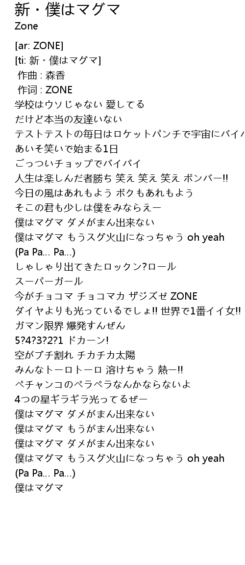 | [01:14.070] | 僕はマグマ もうスグ火山になっちゃう oh yeah |