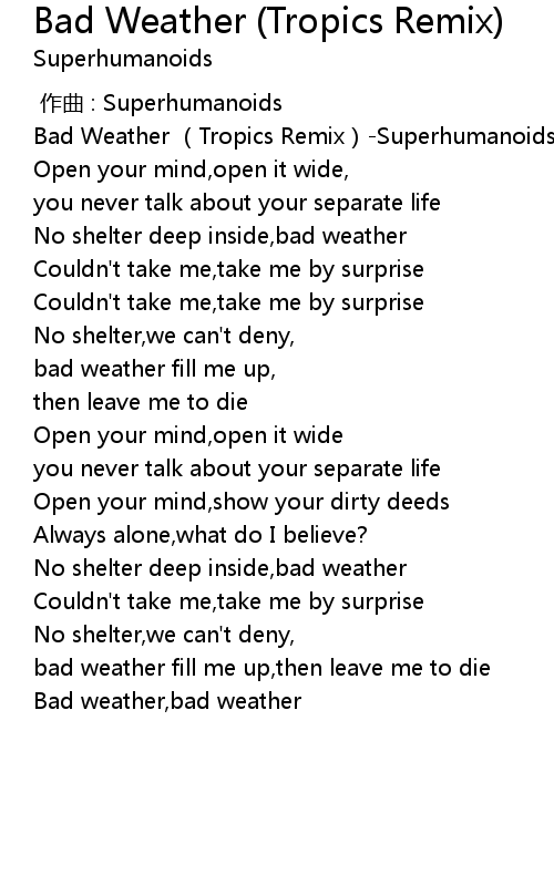 | [00:12.945] | Bad Weather Tropics Remix Superhumanoids |