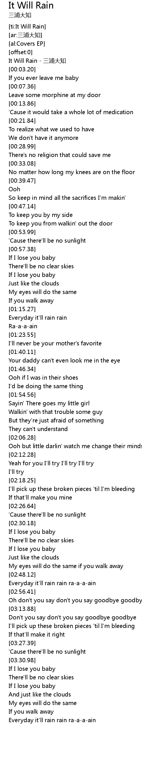 | [00:01.41] | It Will Rain sān pǔ dà zhī |