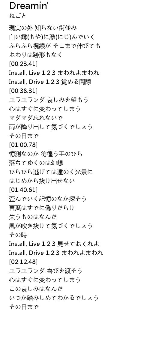 | [00:33.66] | Install, Drive 1.2.3 覚める間際 |