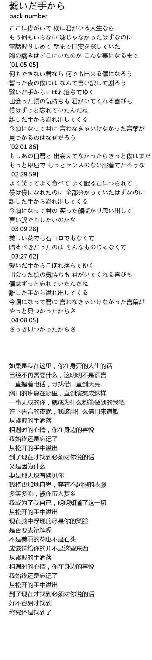 | [01:23.54] | 繋いだ手からこぼれ落ちてゆく |