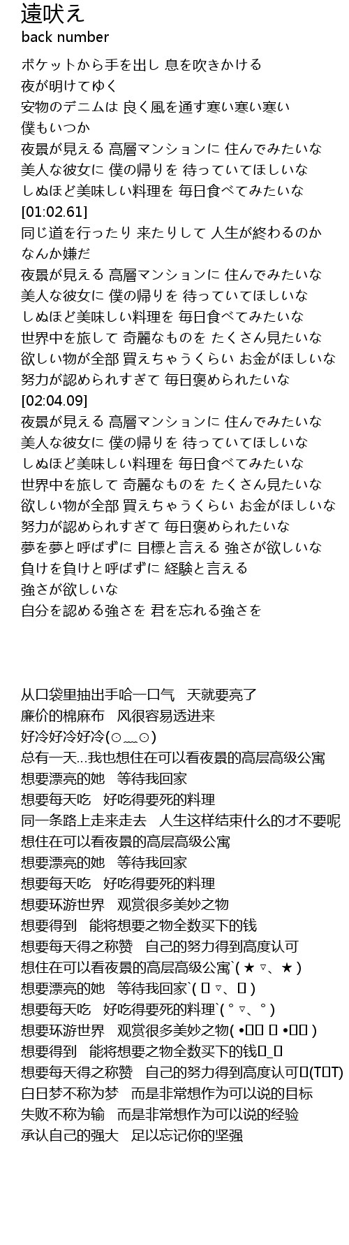 | [02:24.96] | 夜景が見える 高層マンションに 住んでみたいな |