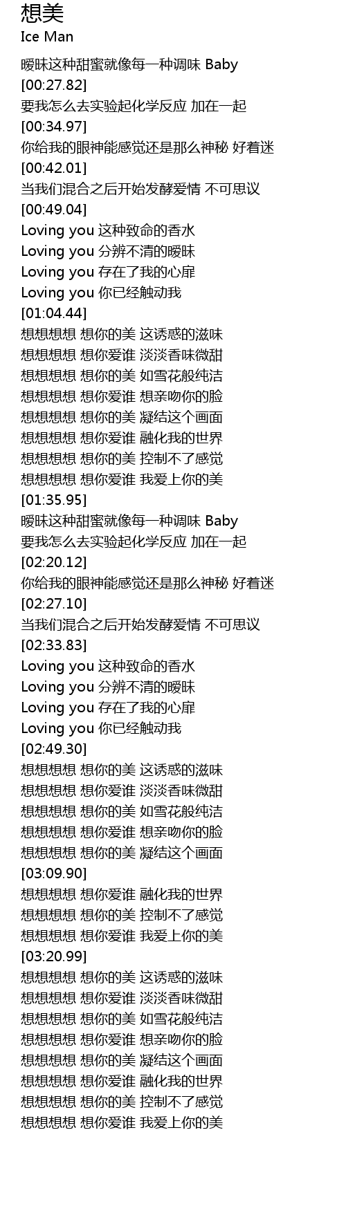 | [01:32.32] | 想想想想 想你爱谁 我爱上你的美 |