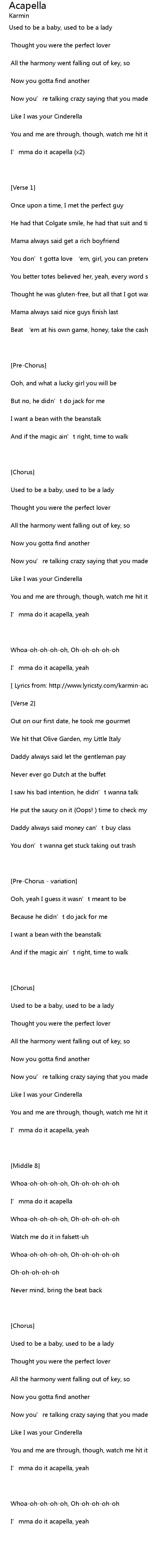 | [ Lyrics from: http://www.lyricsty.com/karmin-acapella-lyrics.html ] | |