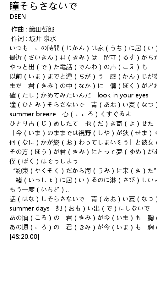 | [01:35.99] | 瞳(ひとみ)そらさないで 青(あお)い夏(なつ)のトキメキの中(なか)で |