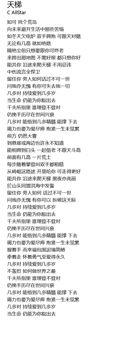 | [02:16.740] | 能共你 沿途来爬天梯 黑夜亦亮丽 |