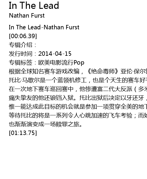 | [00:23.40] | 根据全球知名赛车游戏改编,《绝命毒师》亚伦·保尔饰演的主人公 |