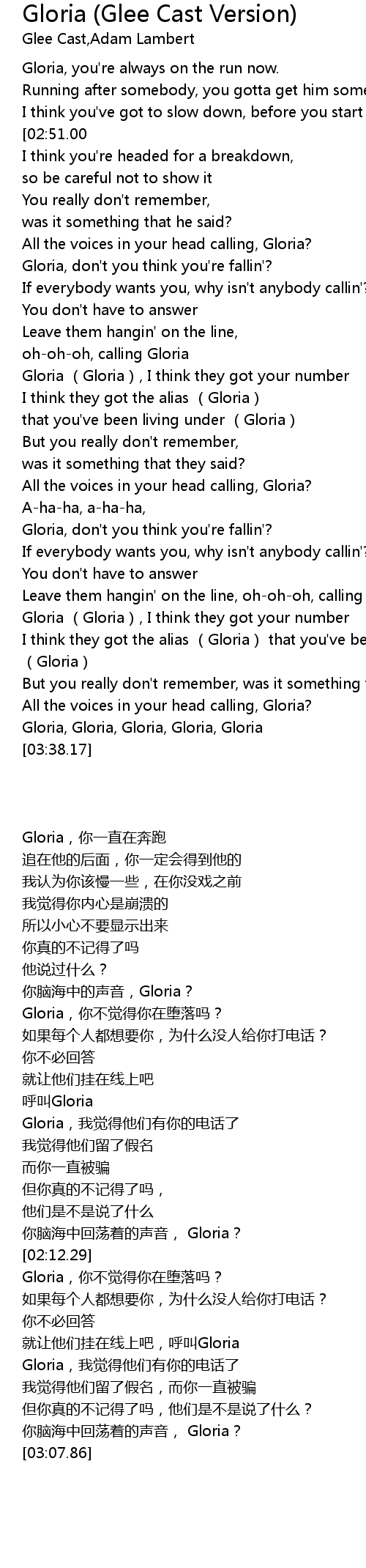 | [02:30.42] | Leave them hangin' on the line, ohohoh, calling Gloria |
