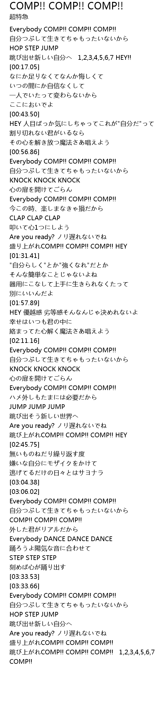 | [03:54.74] | 跳び上がれCOMP!! COMP!! COMP!! 1,2,3,4,5,6,7 HEY!! |