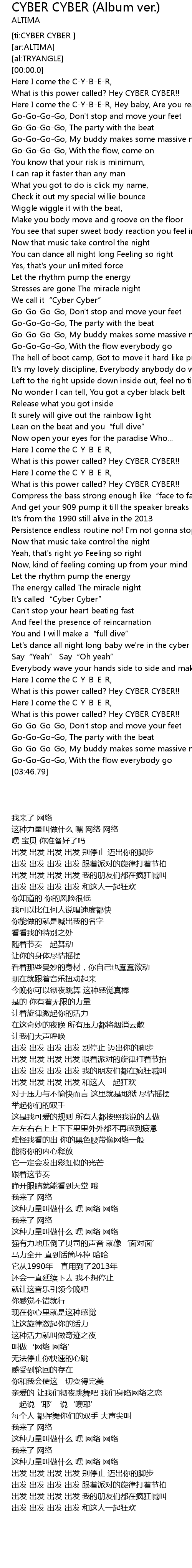 | [00:07.68] | Here I come the CYBER, Hey baby, Are you ready? |