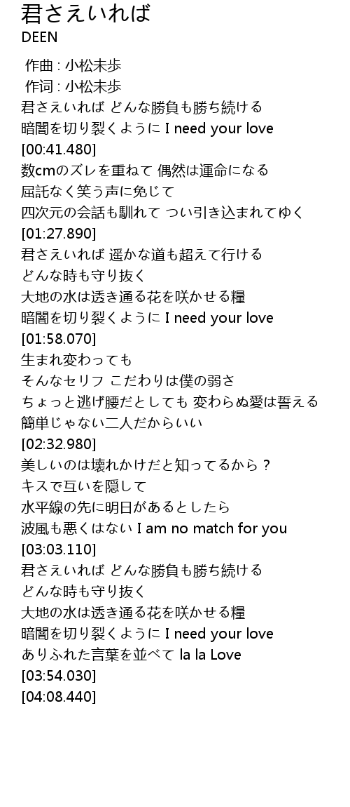 | [03:15.660] | 君さえいれば どんな勝負も勝ち続ける どんな時も守り抜く |