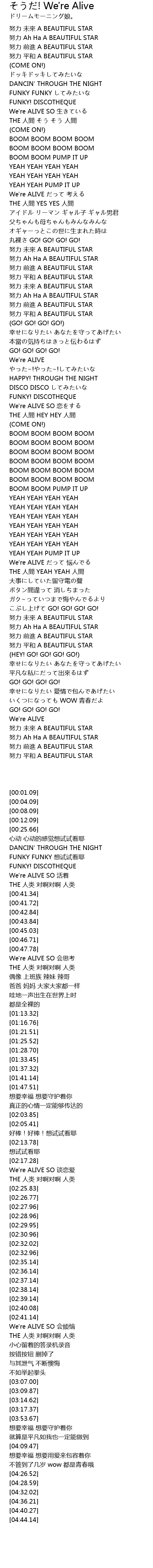 | [00:49.65] | We're ALIVE だって 考える |