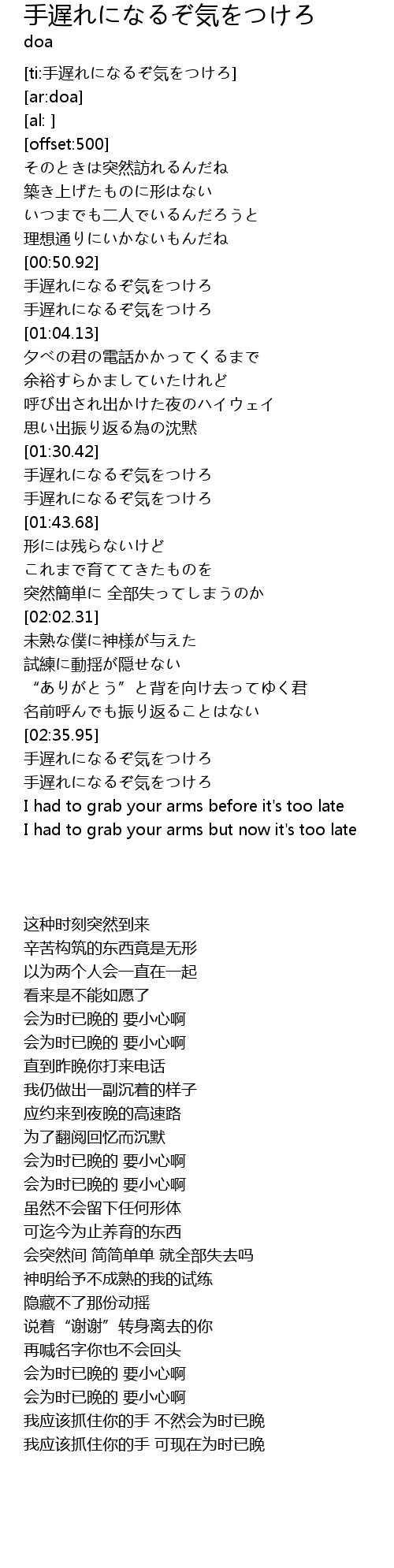| [01:38.84] | 手遅れになるぞ気をつけろ |