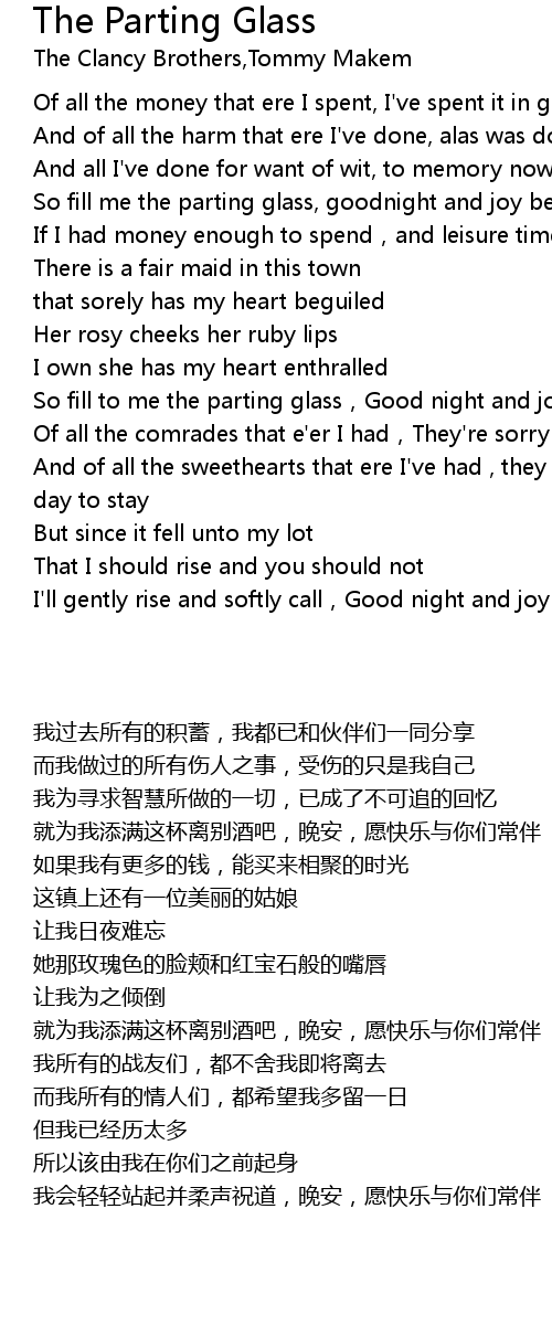| [00:35.20] | So fill me the parting glass, goodnight and joy be with you all |