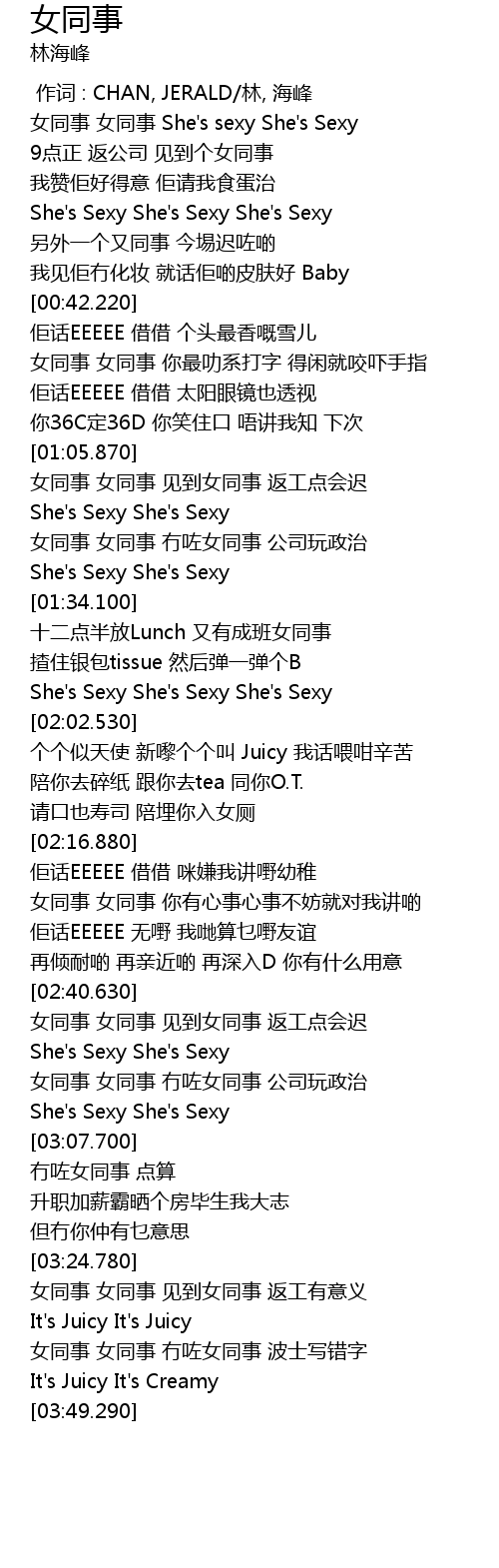 | [03:25.390] | 女同事 女同事 见到女同事 返工有意义 |