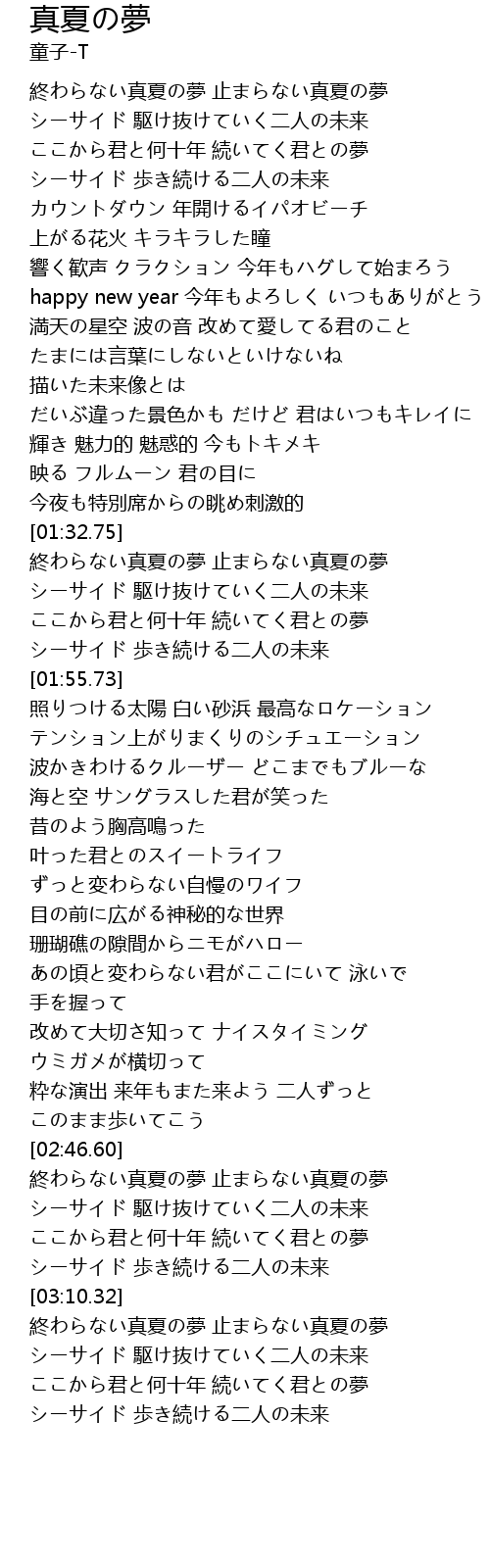 | [02:47.67] | 終わらない真夏の夢 止まらない真夏の夢 |