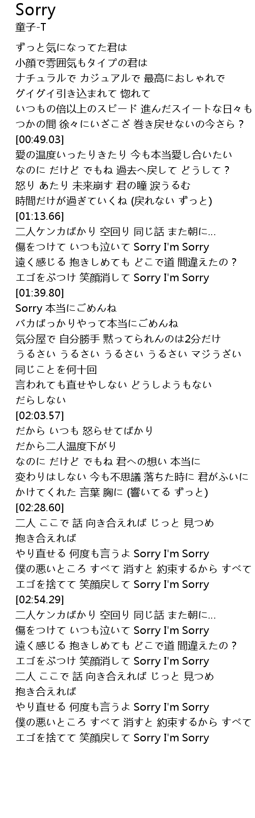 | [03:38.12] | やり直せる 何度も言うよ Sorry I'm Sorry |
