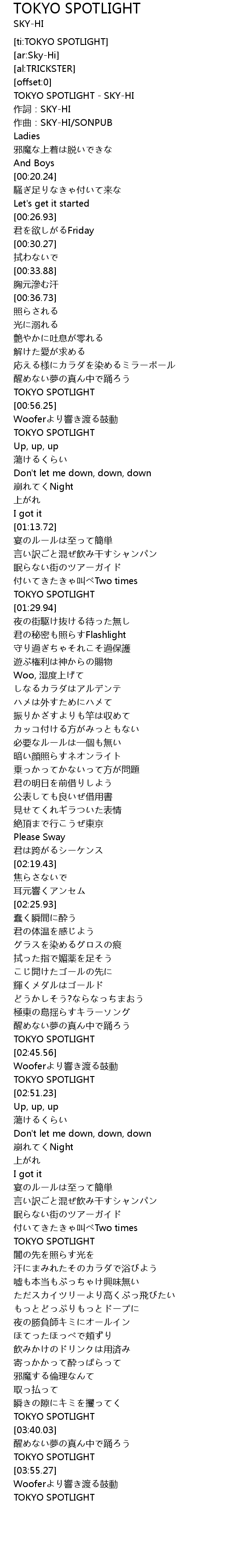 | [00:01.05] | TOKYO SPOTLIGHT - SKY-HI |