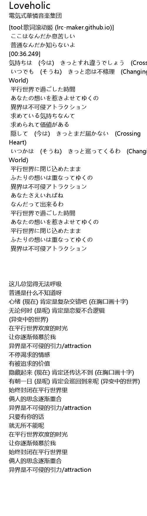 | [00:36.249] | 気持ちは (今は) きっとすれ違うでしょう (Crossing Heart) |