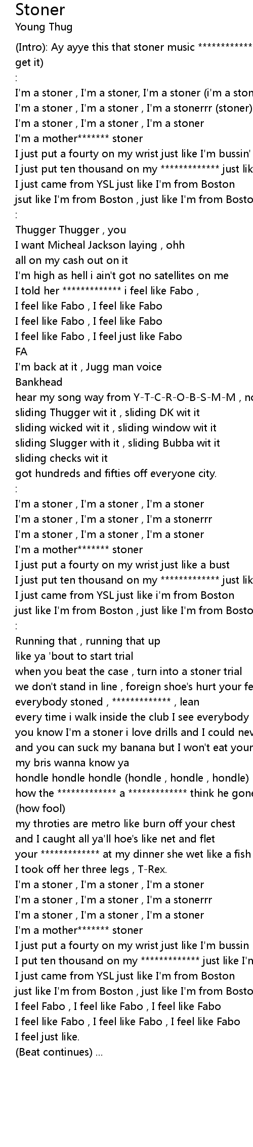 (Intro): Ay ayye this that stoner music ************* , STONER , STONERRR (lets get it) |
