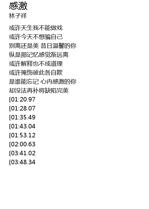 | [03:56.14][03:41.02][02:08.15] | 是情还是戏 只剩感激给你 |