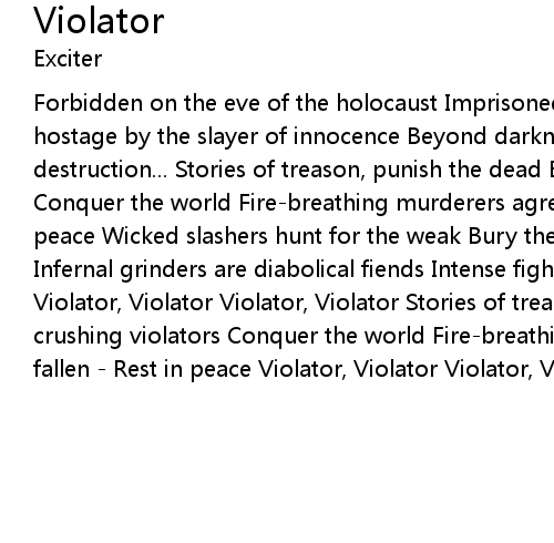Forbidden on the eve of the holocaust Imprisoned by the mentor of Death Held hostage by the slayer of innocence Beyond darkness there's nothing but destruction... Stories of treason, punish the dead Bone crushing violators Conquer the world Fire-breathing murderers agree Death to the fallen - Rest in peace Wicked slashers hunt for the weak Bury the ones That are chosen slavery Infernal grinders are diabolical fiends Intense fighting crucifying all Violator, Violator Violator, Violator Stories of treason, punish the dead Bone crushing violators Conquer the world Fire-breathing murderers agree Death to the fallen - Rest in peace Violator, Violator Violator, Violator |