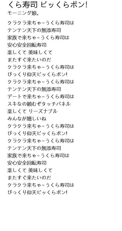| [00:14.62] | クラクラ来ちゃ~うくら寿司は |