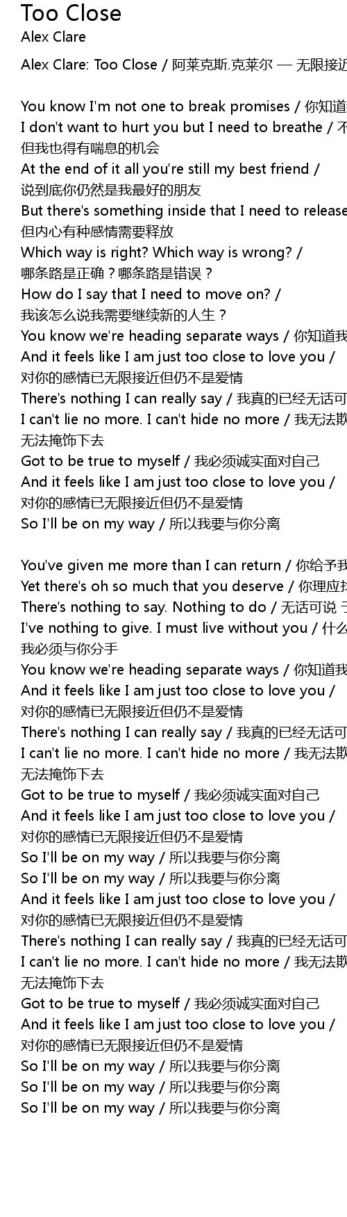| Alex Clare: Too Close a lai ke si. ke lai er wu xian jie jin | |