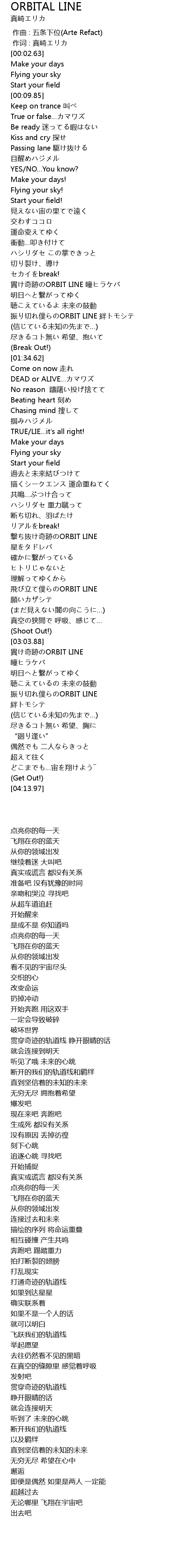 | [02:47.87] | 飛び立て僕らのORBIT LINE |