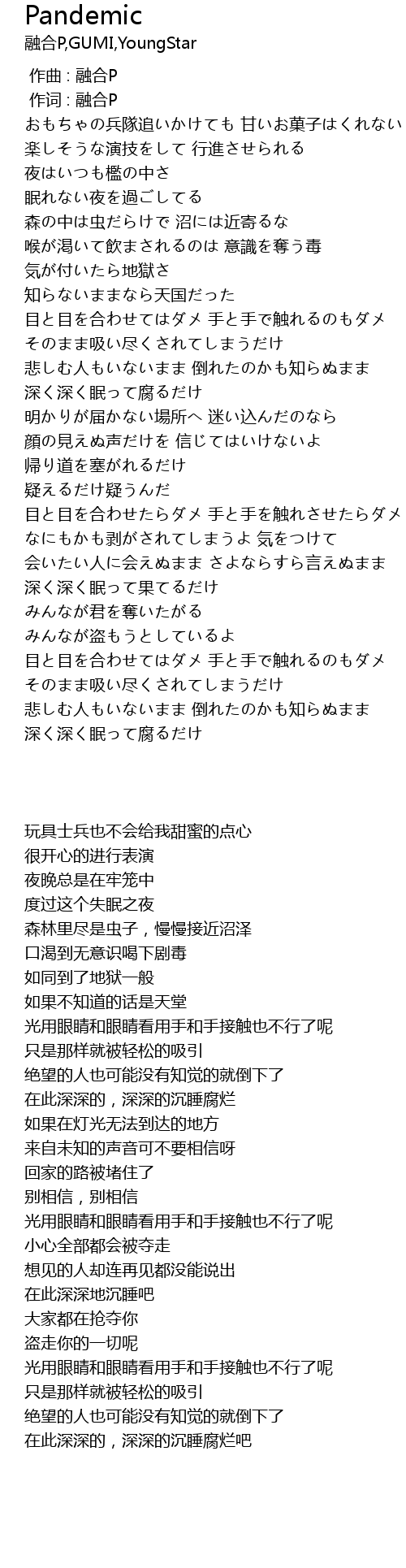 | [01:01.51] | 喉が渇いて飲まされるのは 意識を奪う毒 |