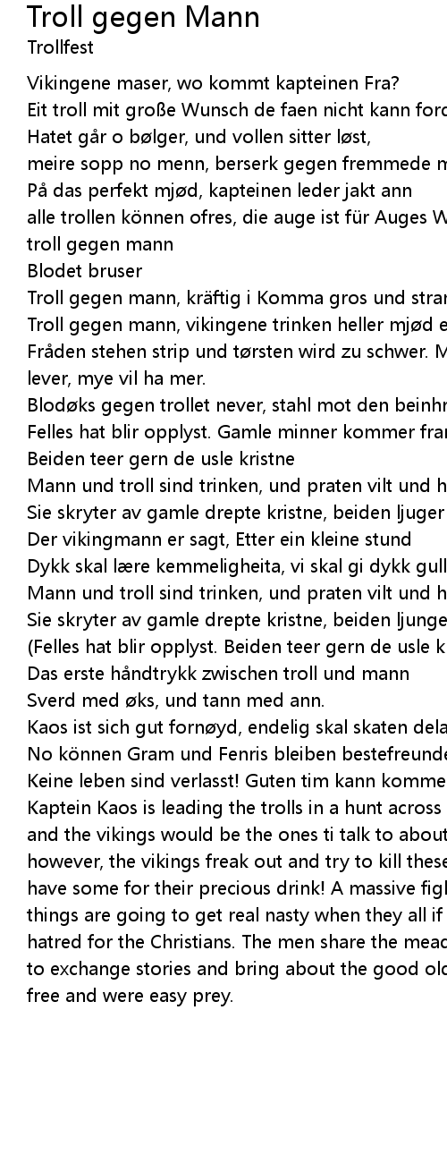 | Troll gegen mann, vikingene trinken heller mjød enn vann | |