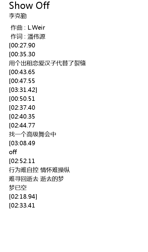 | [03:28.06][03:08.49][02:48.88][01:50.11][01:07.02] | Show off Show off Showing off |