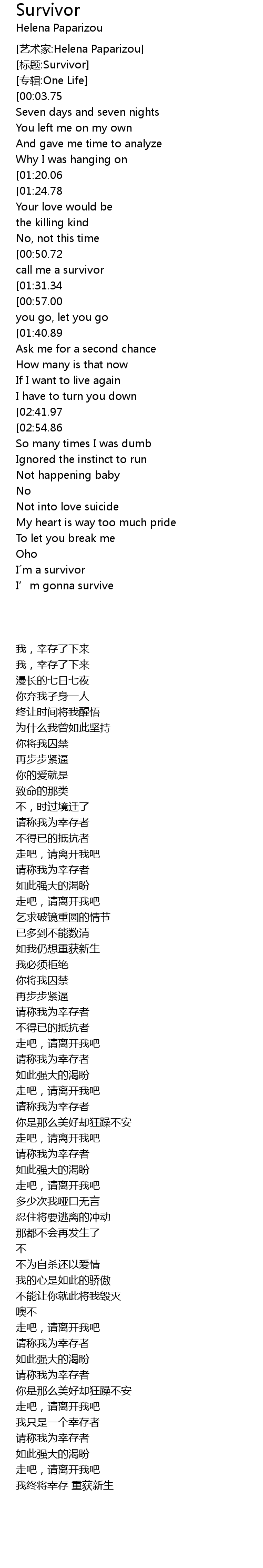 | [00:41.41][00:50.72][01:28.44][01:37.78][01:47.07][01:56.61][02:28.63][02:39.03][02:48.71] | Just call me a survivor |