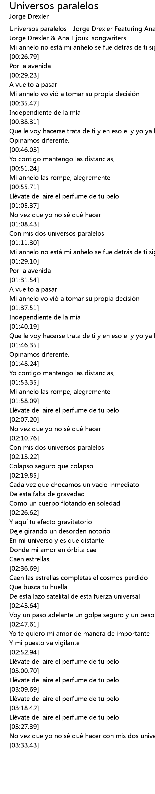 | [00:00.90] | Universos paralelos Jorge Drexler Featuring Ana Tijoux |