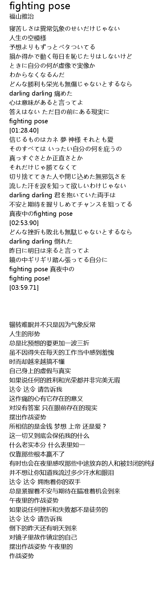 | [03:47.57] | fighting pose zhēn yè zhōng |