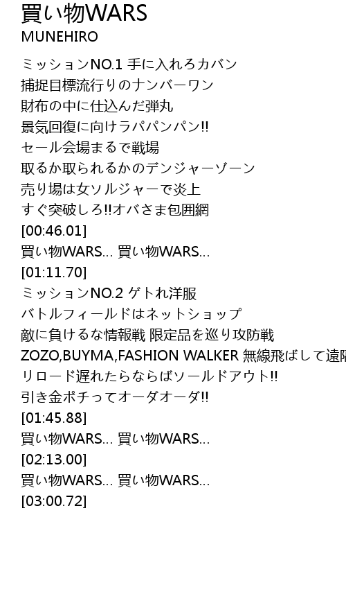| [01:47.96] | 買い物WARS… 買い物WARS… |