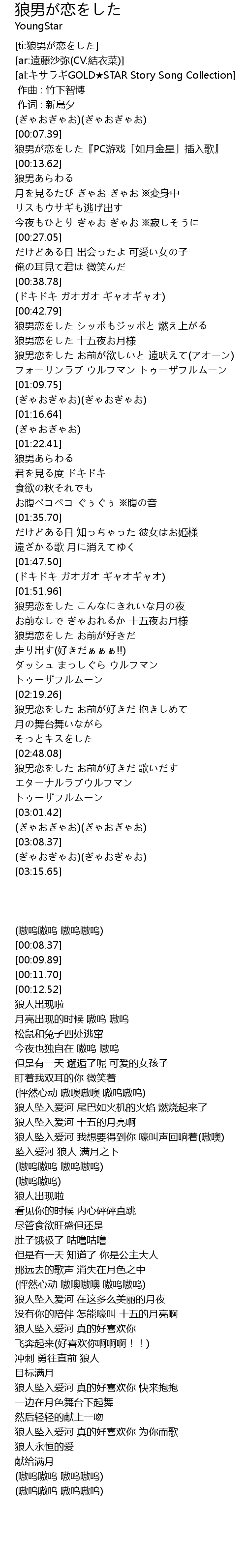 | [00:56.86] | 狼男恋をした お前が欲しいと 遠吠えて(アオーン) |