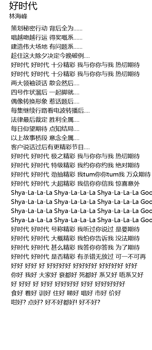 | [03:01.300] | 好时代 好时代 特级精彩 我约你你约我 绝对期待 |