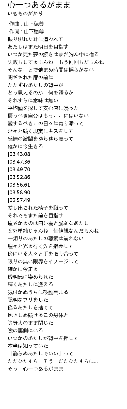 | [01:43.52][02:57.49][04:03.35] | 心一つあるがまま |