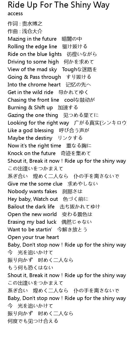 | Baby, Don' t stop now! Ride up for the shiny way | |