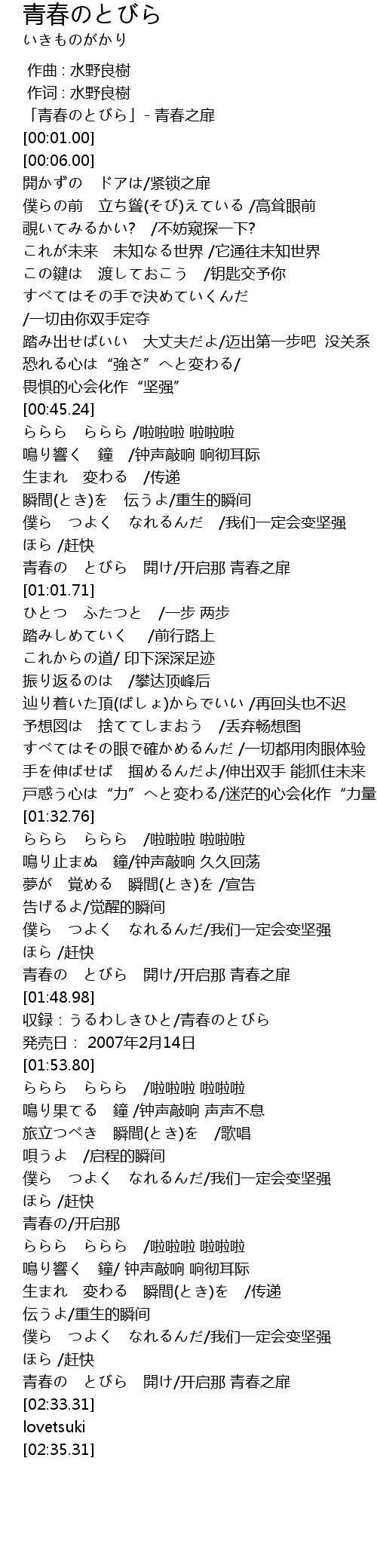 | [00:56.57] | 青春の とびら 開け/开启那 青春之扉 |
