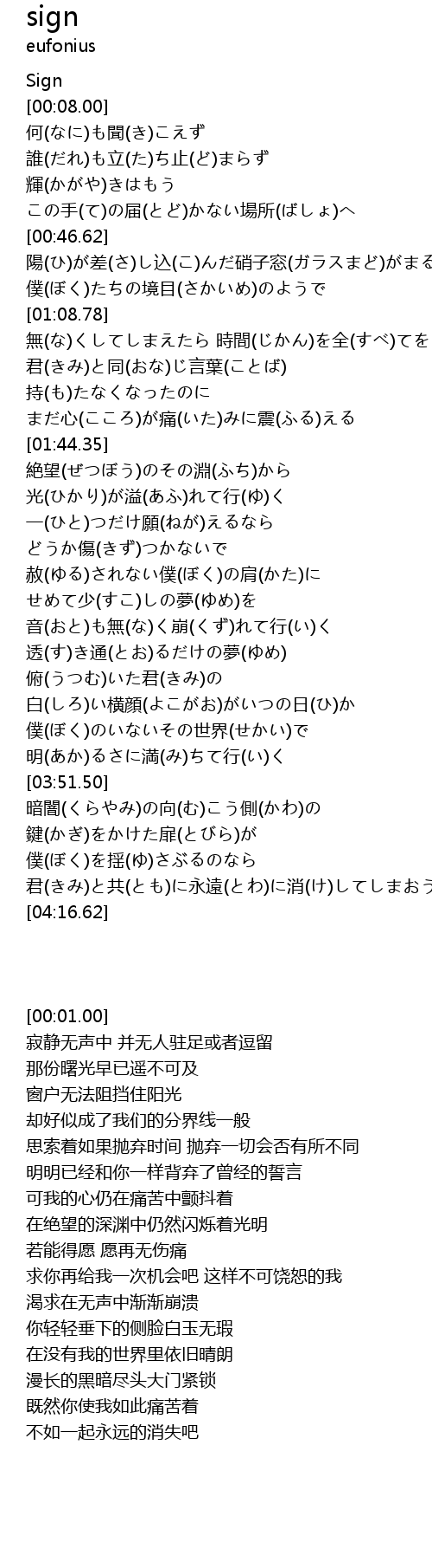 | [00:24.10] | 何(なに)も聞(き)こえず 誰(だれ)も立(た)ち止(ど)まらず |