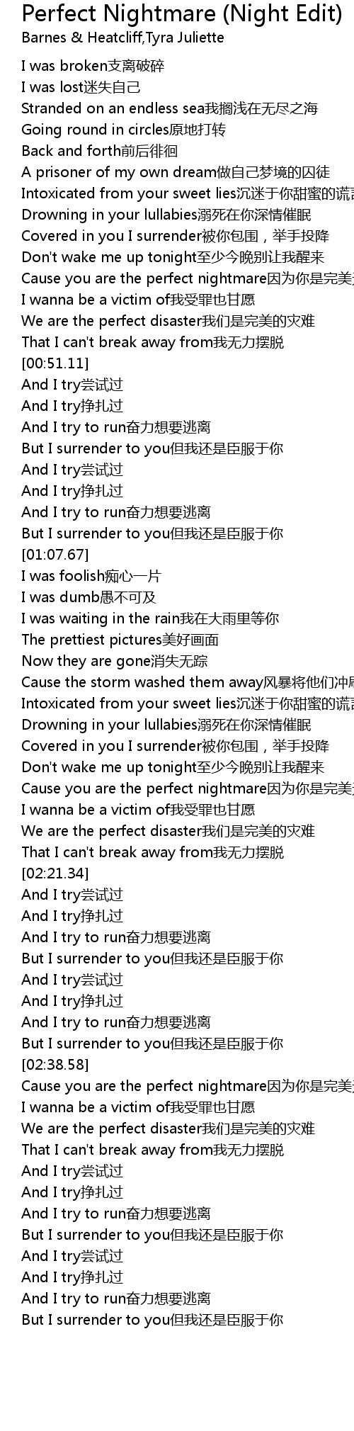| [03:07.33] | Cause you are the perfect nightmare yīn wèi nǐ shì wán měi wú quē de è mèng |