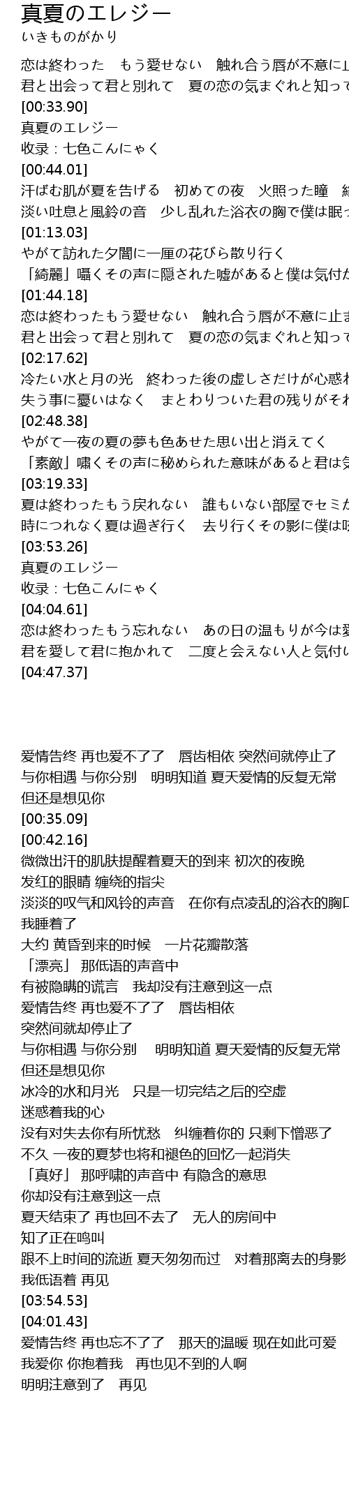 | [03:20.35] | 夏は終わったもう戻れない 誰もいない部屋でセミが鳴いてる |
