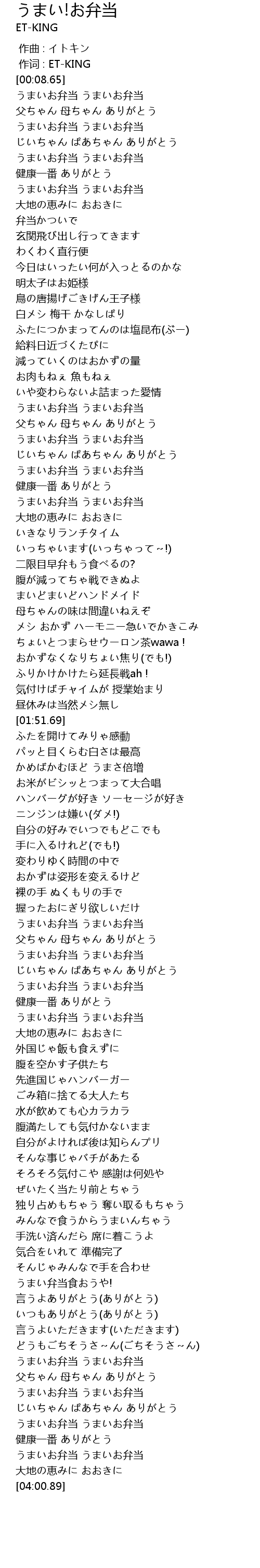 | [03:45.87] | うまいお弁当 うまいお弁当 |