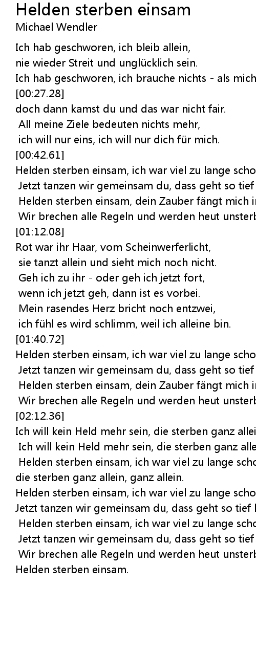 | [02:43.53] | Helden sterben einsam, ich war viel zu lange schon allein. |