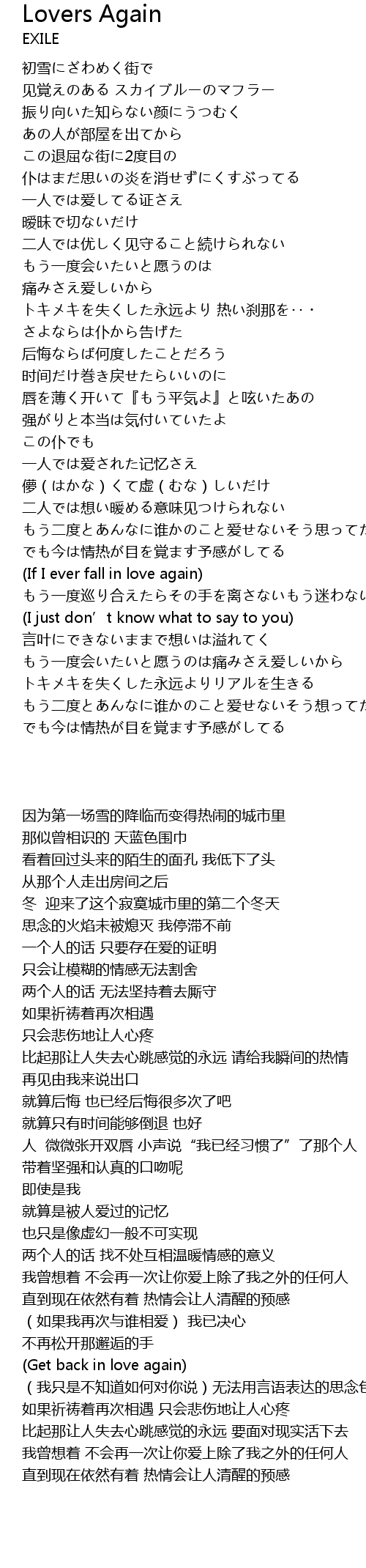 | [03:18.69] | (If I ever fall in love again) もう一度巡り合えたらその手を离さないもう迷わないさ |
