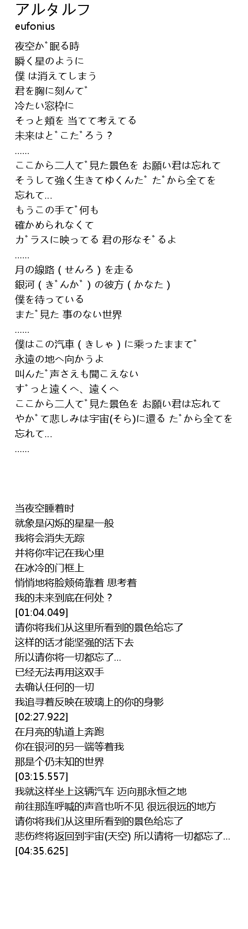 | [04:18.009] | やがて悲しみは宇宙(そら)に還る だから全てを 忘れて… |