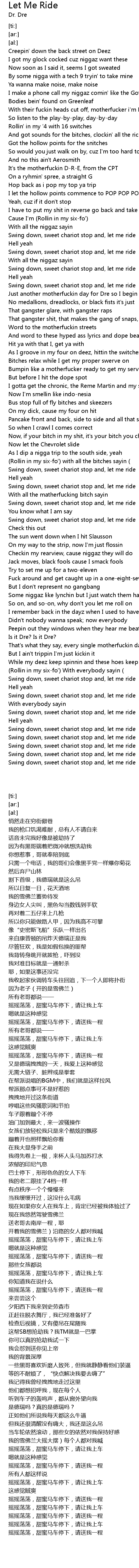 | [01:32.22] | Just another motherfuckin day for Dre so I begin like this |